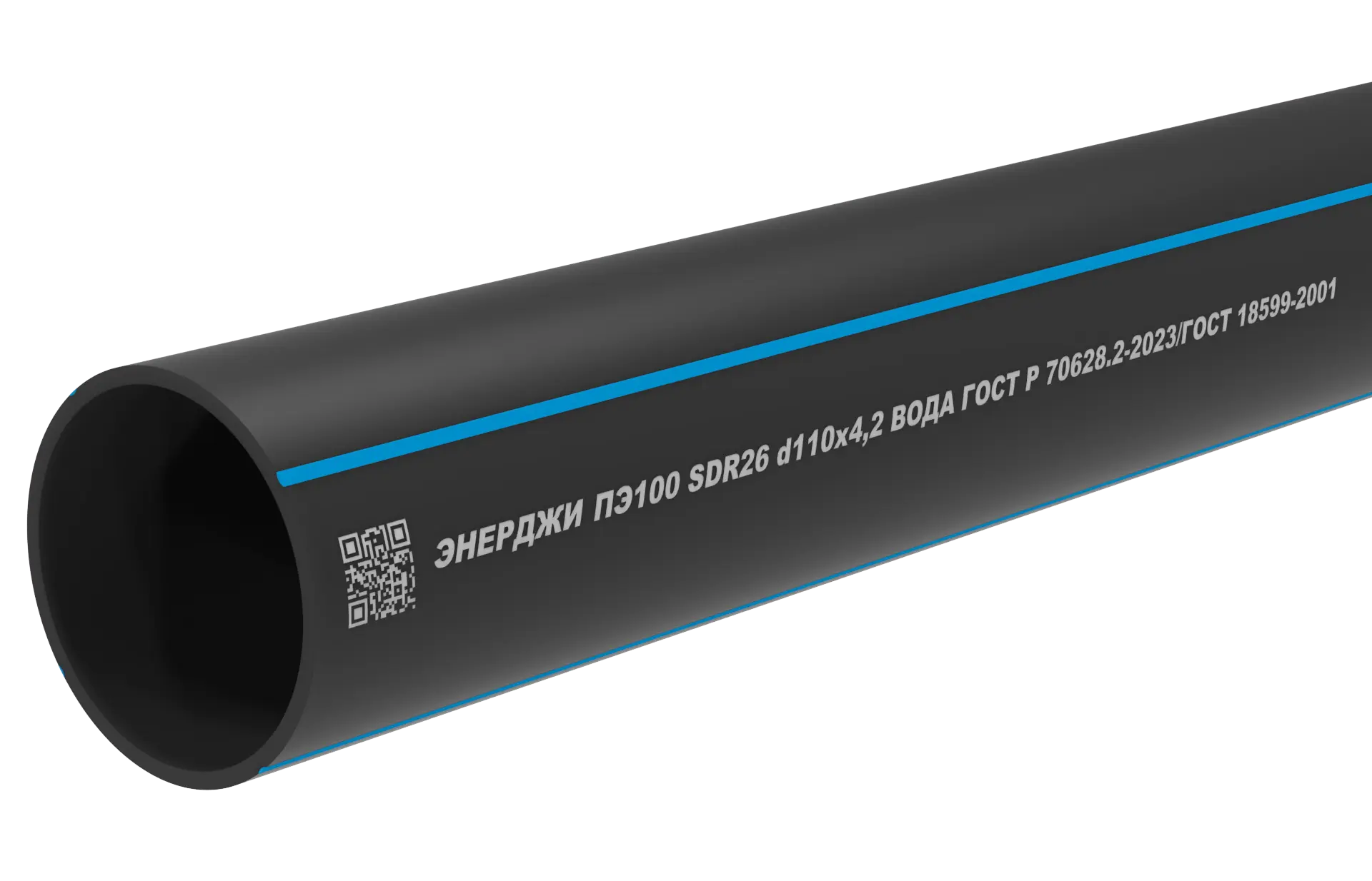 Труба питьевая ПЭ100 SDR 26 d110 х 4,2 мм по стандарту ГОСТ 18599-2001 (код товара: 020132) - однослойная напорная труба для воды монолитной конструкции из светостабилизированного полиэтилена марки ПЭ 100, ПЭ100 RC и ПЭ 100+.