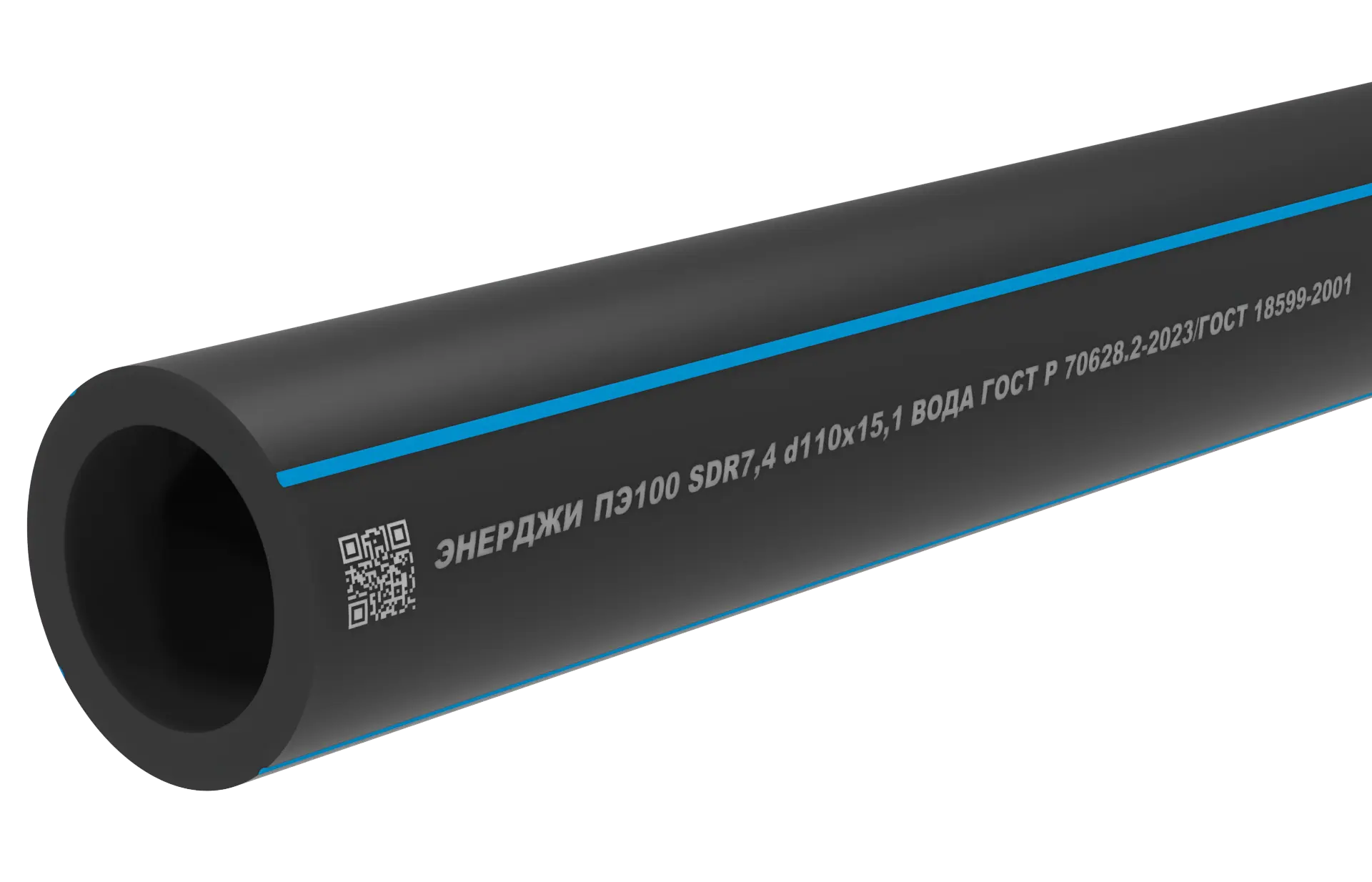 Труба питьевая ПЭ100 SDR 7,4 d110 х 15,1 мм по стандарту ГОСТ 18599-2001 (код товара: 020156) - однослойная напорная труба для воды монолитной конструкции из светостабилизированного полиэтилена марки ПЭ 100, ПЭ100 RC и ПЭ 100+.