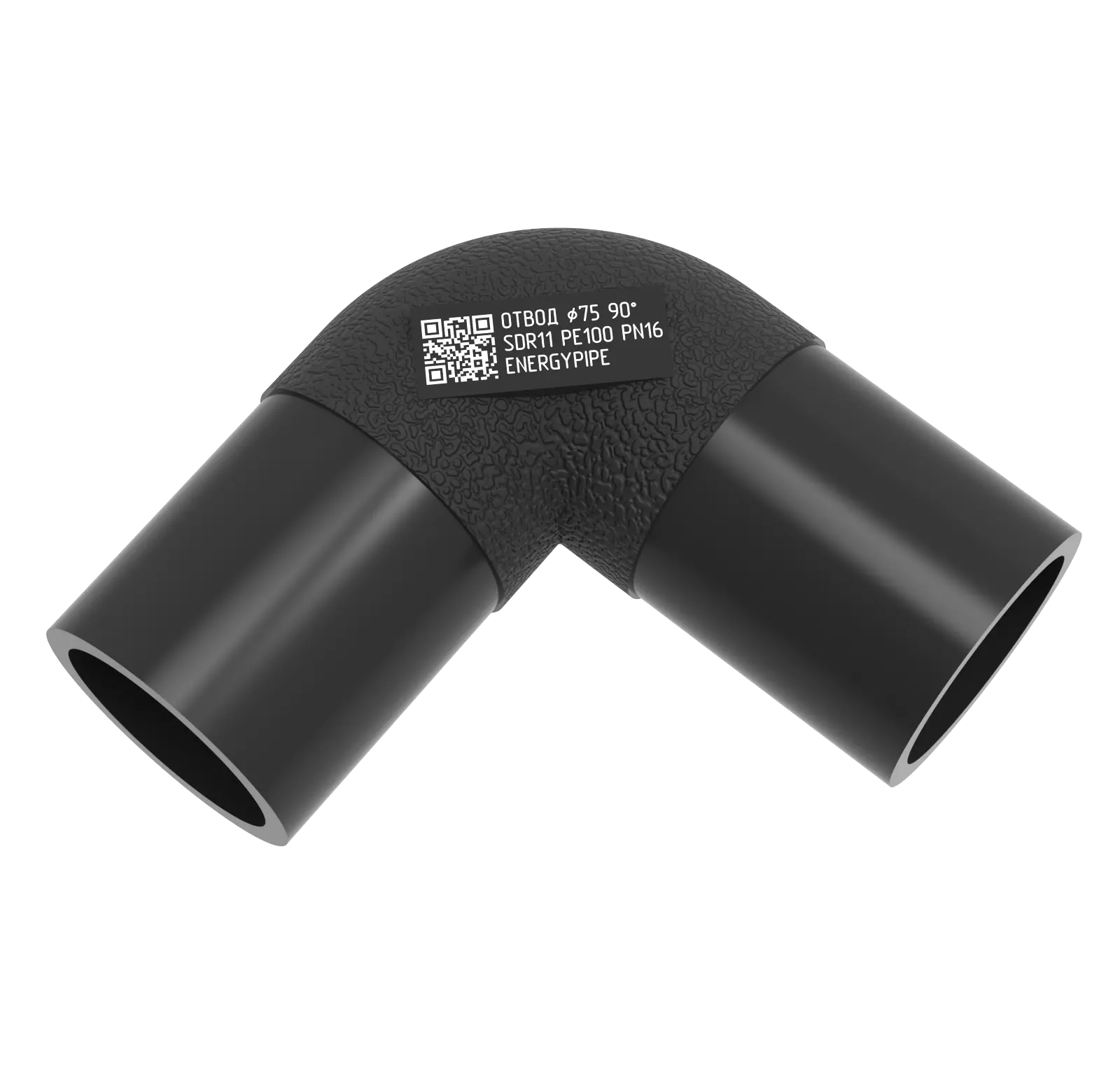 Литой полиэтиленовый отвод 90° диаметром d 75 мм SDR 11 изготовлен методом литья под давлением из устойчивого к УФ полиэтилена марки ПЭ100 высокой плотности.