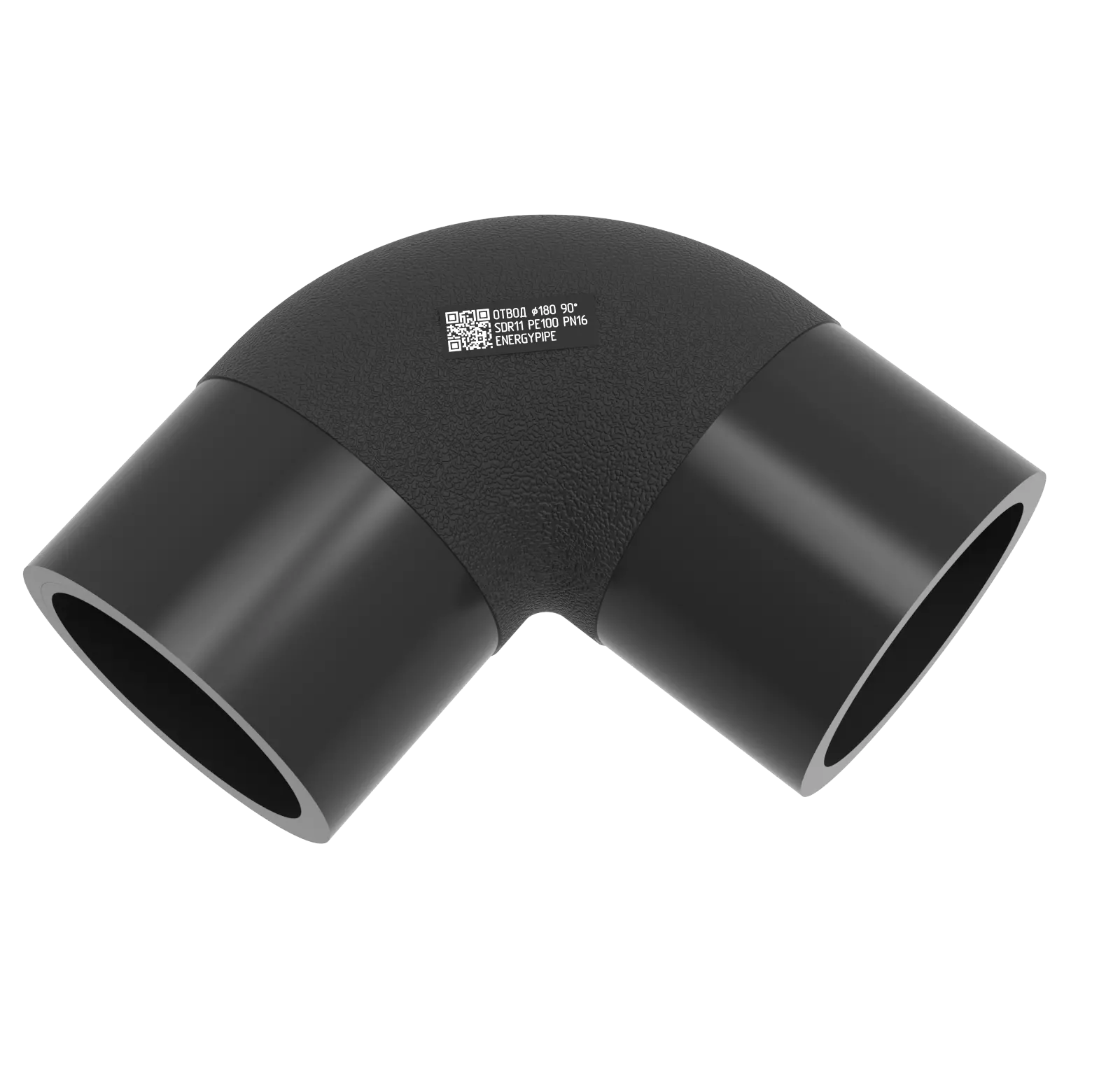 Литой полиэтиленовый отвод 90° диаметром d 180 мм SDR 11 изготовлен методом литья под давлением из устойчивого к УФ полиэтилена марки ПЭ100 высокой плотности.