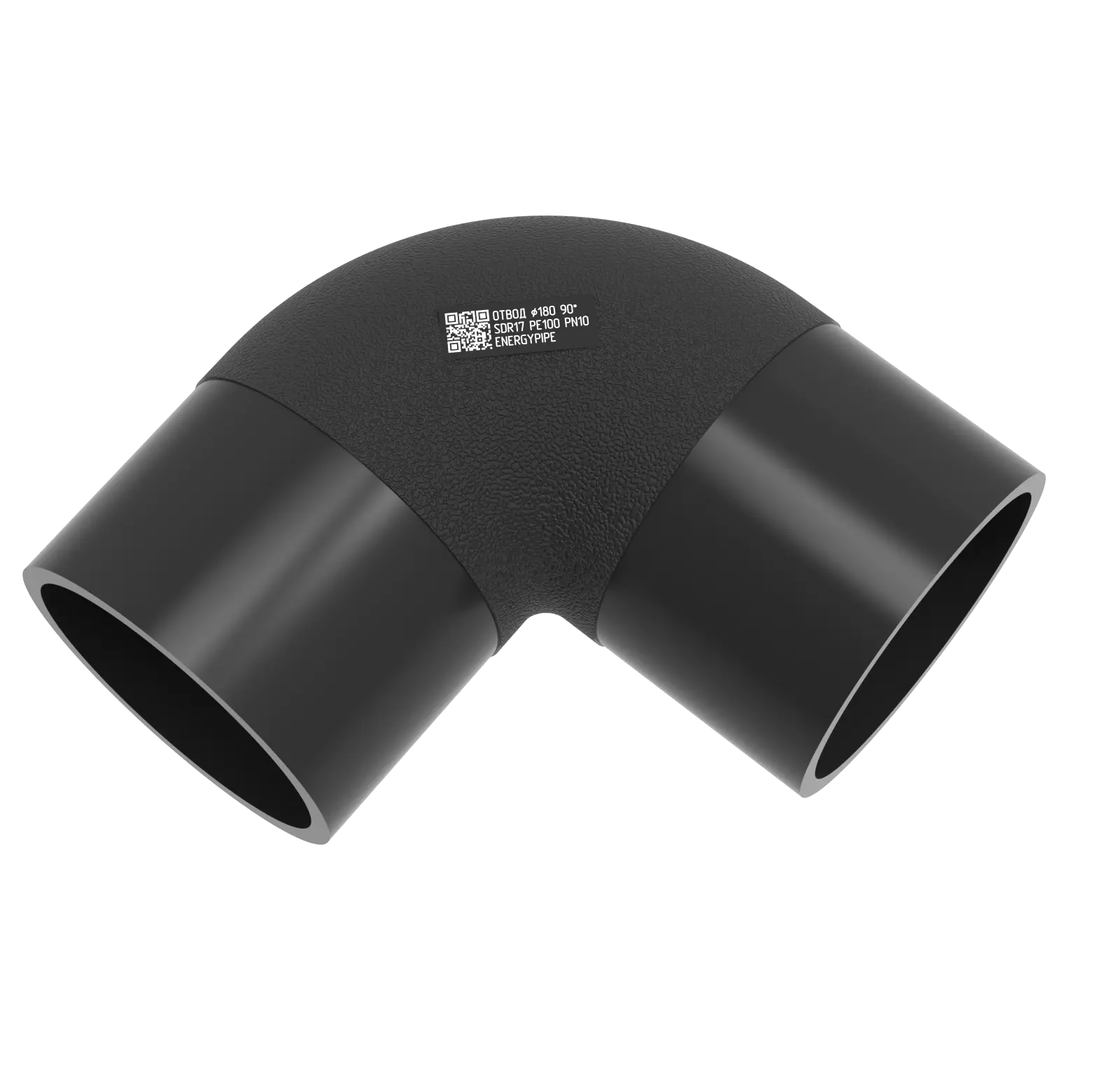 Литой полиэтиленовый отвод 90° диаметром d 180 мм SDR 17 изготовлен методом литья под давлением из устойчивого к УФ полиэтилена марки ПЭ100 высокой плотности.